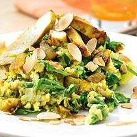 2)Ui in olie glazig bakken, kerriepoeder 1 min. meebakken en in een schaaltje doen